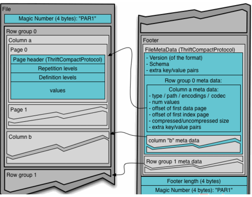 通常情况下,在存储 Parquet 数据的时候会按照 Block 大小设置行组的大小,由于一般 情况下每一个 Mapper 任务处理数据的最小单位是一个 Block,这样可以把每一个行组由一 个 Mapper 任务处理,增大任务执行并行度。Parquet 文件的格式。