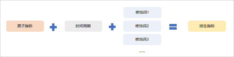 指标是衡量业务特征的统计数值,用于体现企业某一业务活动的业务状况。指标通常分为原子指标和派生指标,与指标相关的参数还包括修饰词和时间周期。派生指标则是由原子指标 + 时间周期 + 一个或多个修饰词组成。