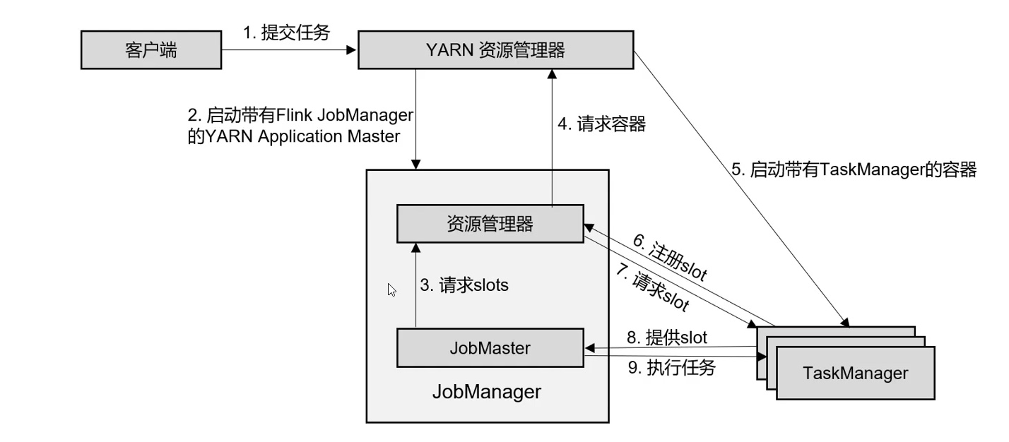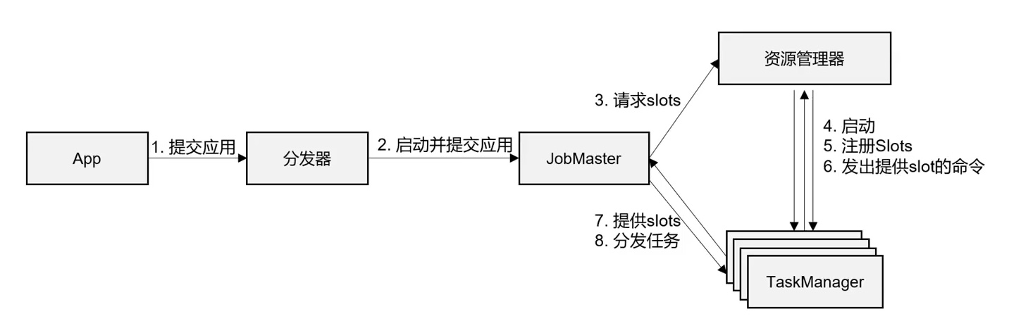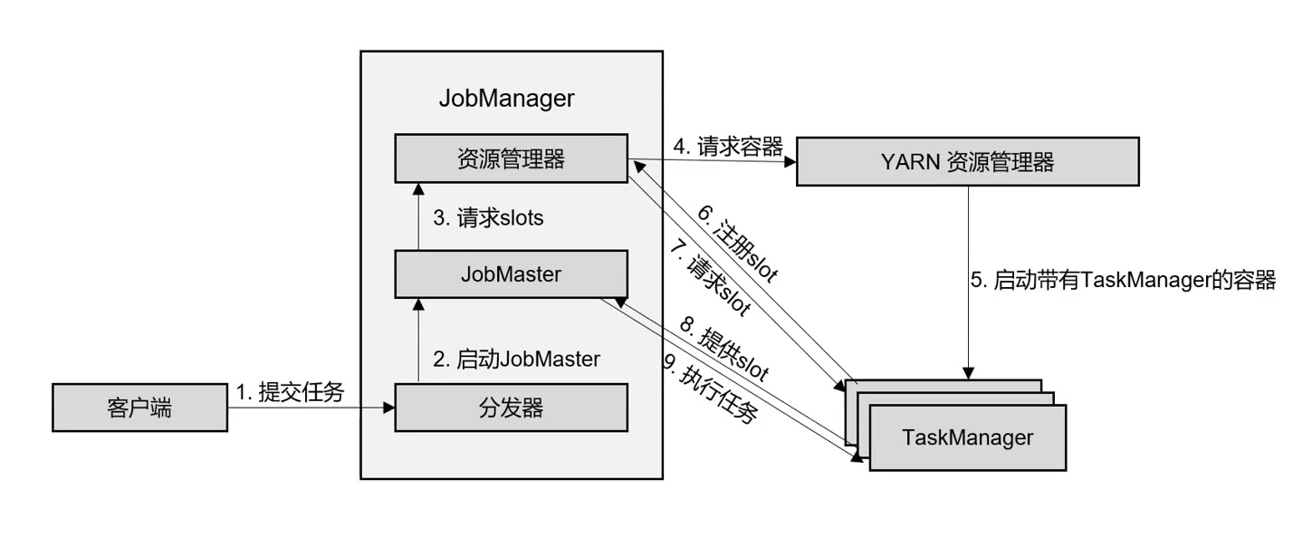 - 启动之后,TaskManager 会向资源管理器注册它的插槽;收到资源管理器的指令后, TaskManager 就会将一个或者多个插槽提供给 JobManager 调用。JobManager 就可以向插槽 分配任务(tasks)来执行了。