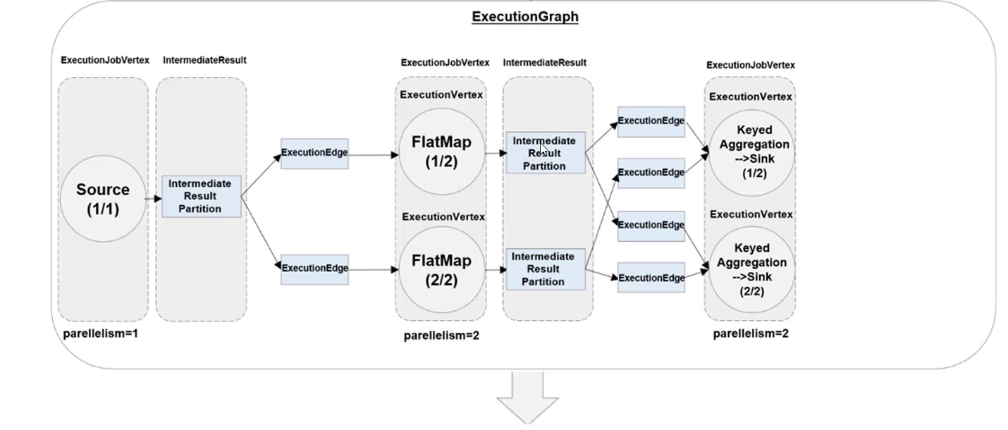 - JobManager 会把 JobGraph 转换成一个物理层面的数据流图,这个图被叫做 “执行图”(ExecutionGraph),包含了所有可以并发执行的任务。