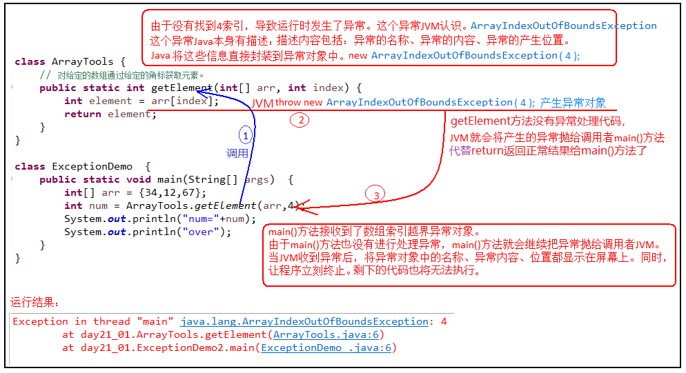 运行下面的程序,程序会产生一个数组角标越界异常ArrayIndexOfBoundsException。我们通过图解来解析下异常产生和抛出的过程。