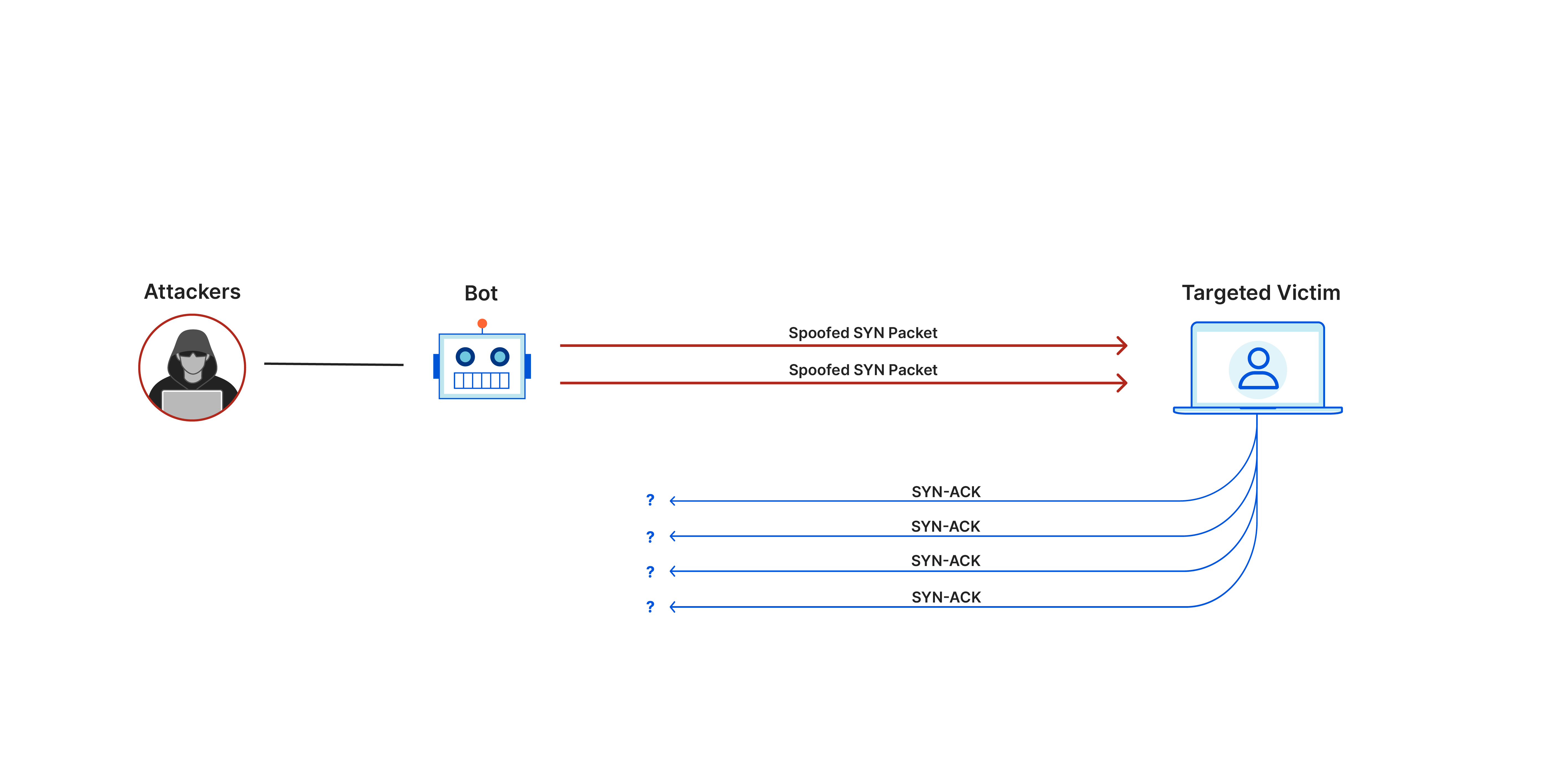 此类攻击利用 TCP 握手(两台计算机发起网络连接时要经过的一系列通信),通过向目标发送大量带有伪造源 IP 地址的 TCP“初始连接请求”SYN 数据包来实现。