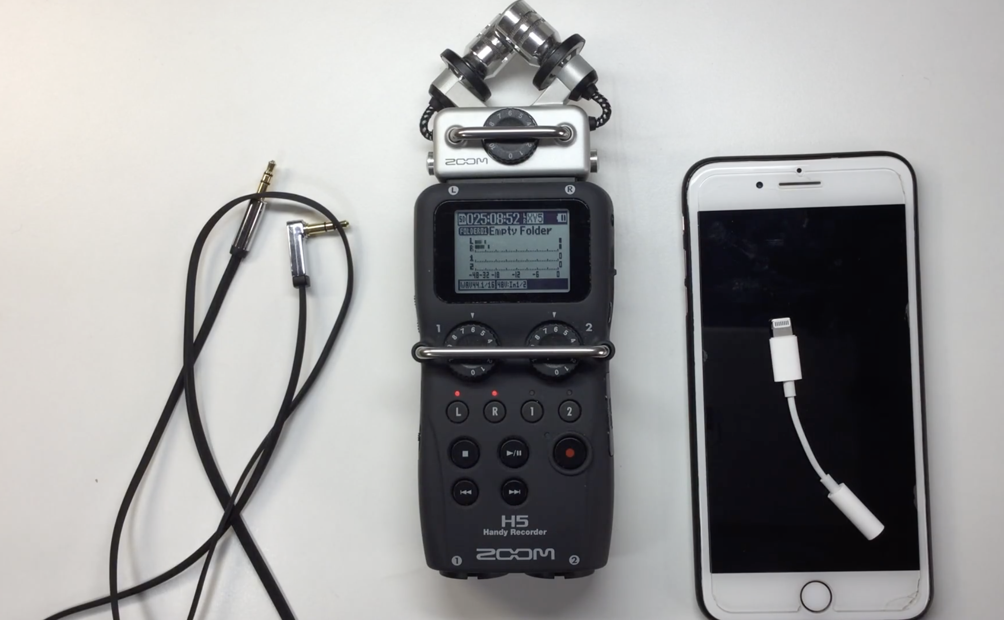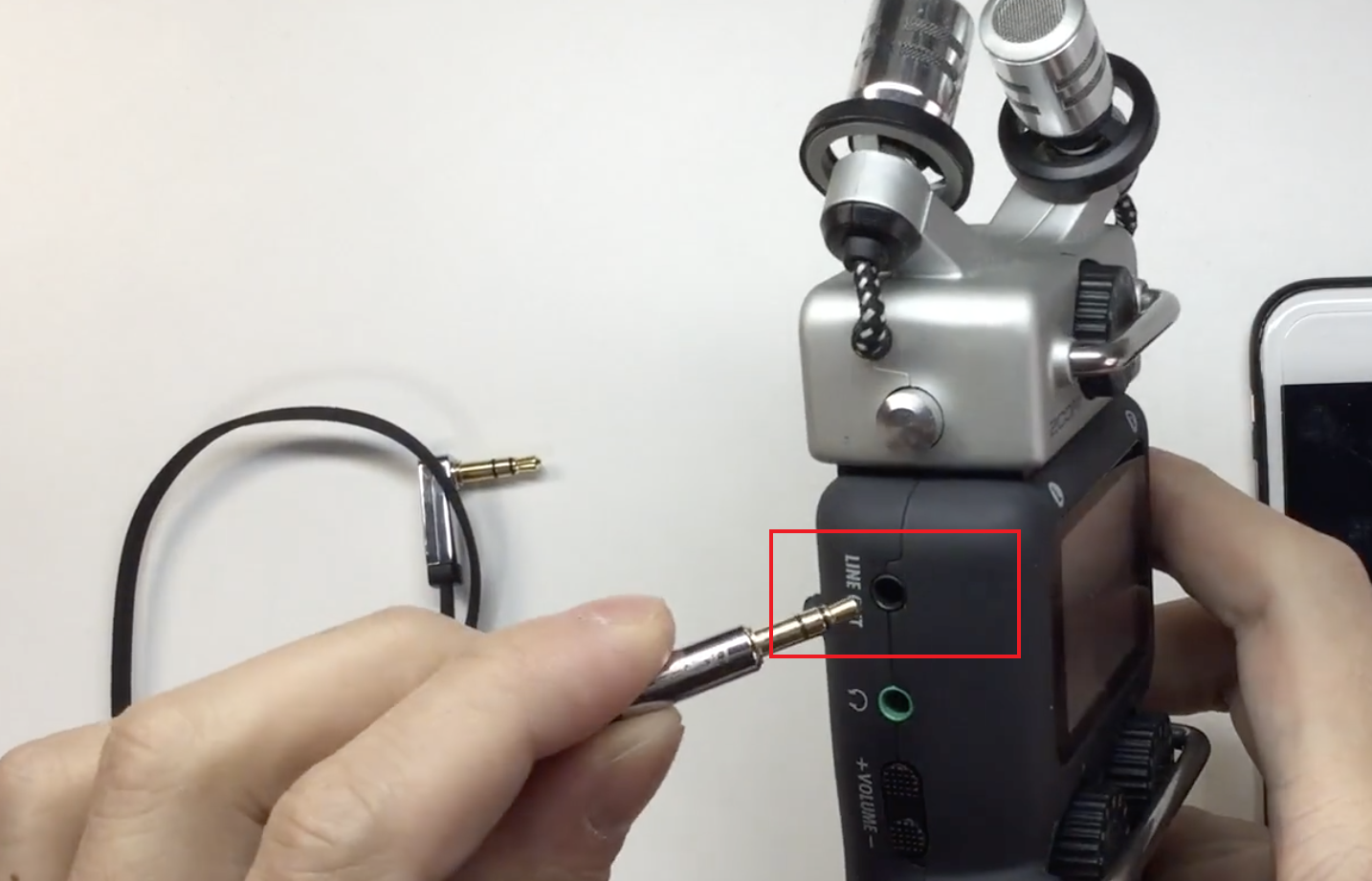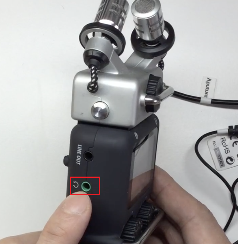 需要一根aux连接线,两头都是公的,一头插H5的LINE OUT,一头插单反,输出音量在左侧按钮设置